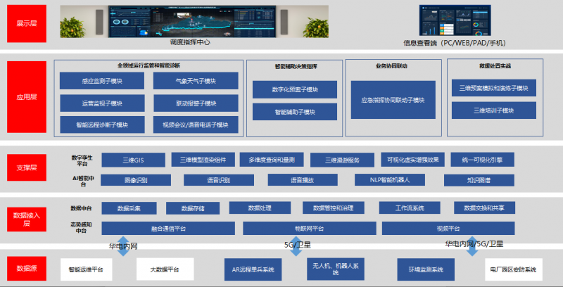 利用大数据、数字孪生、物联网、5G/卫星通讯等先进技术,在区域内建设的生产运营监管及可视化应急指挥系统,其通过打造“应用层-生产运营监管平台”“数据接入层-数据中台”“支撑层-数字孪生平台”“支撑层-AI智能中台”四大平台,以多级平台特性和新型指挥方式,建立发电领域区域级的科学高效的可视化应急监管调度指挥体系,实现了对区域运营数据、设备状态数据、应急物资等数据的实时监管,打通了指挥层到终端感知层的数据链路,满足本区域单位对极端天气、自然灾害、重大危险作业、主要设备故障等重大事件的全面态势掌握和深入及时处置,做到“可视监开云真人官方网站 云开真人控、及时发现、直观指挥、精准调度”。