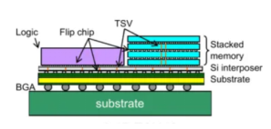 图2: Chiplet封装示意图,存储单元可以多层堆叠而算力单元只能平铺