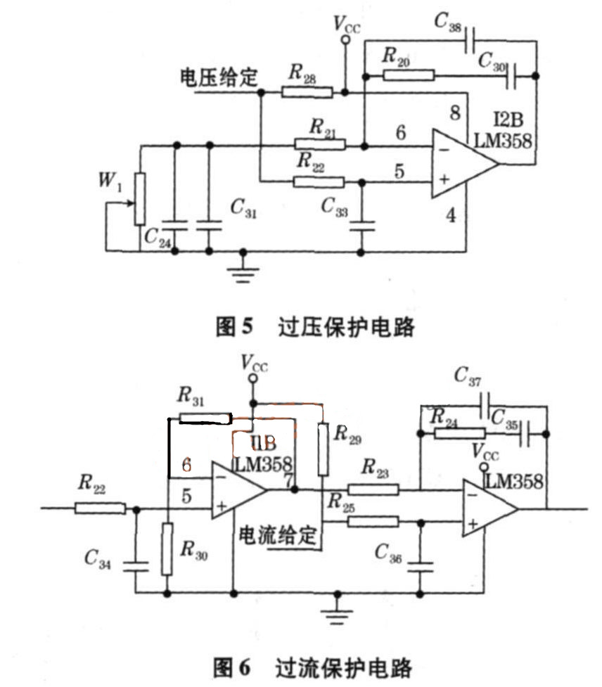 过流保护和过压保护是在主电路中采样输入到保护电路中, 对电源起到保护作用。保护电路如图5、图6所示。