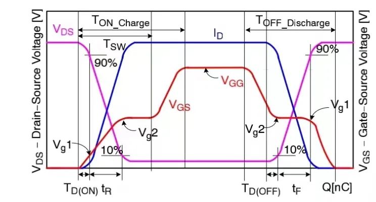 开关时间定义为到达坪电压(给 MOSFET 提供了总共 Qgs+ Qgd的电荷)末端所花费的时间,如图21所示。