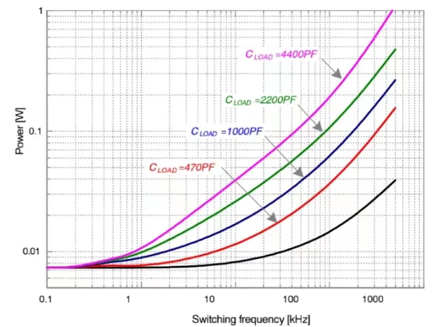图23表示计算的栅极驱动器功耗与频率和负载电容的关系(VDD=15 V)。此曲线可用于计算栅极驱动器造成的功耗。