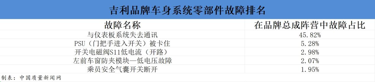 维修数据显示,吉利汽车所涉及的故障车辆样本数量为6020辆,有效故障表现为101607条。